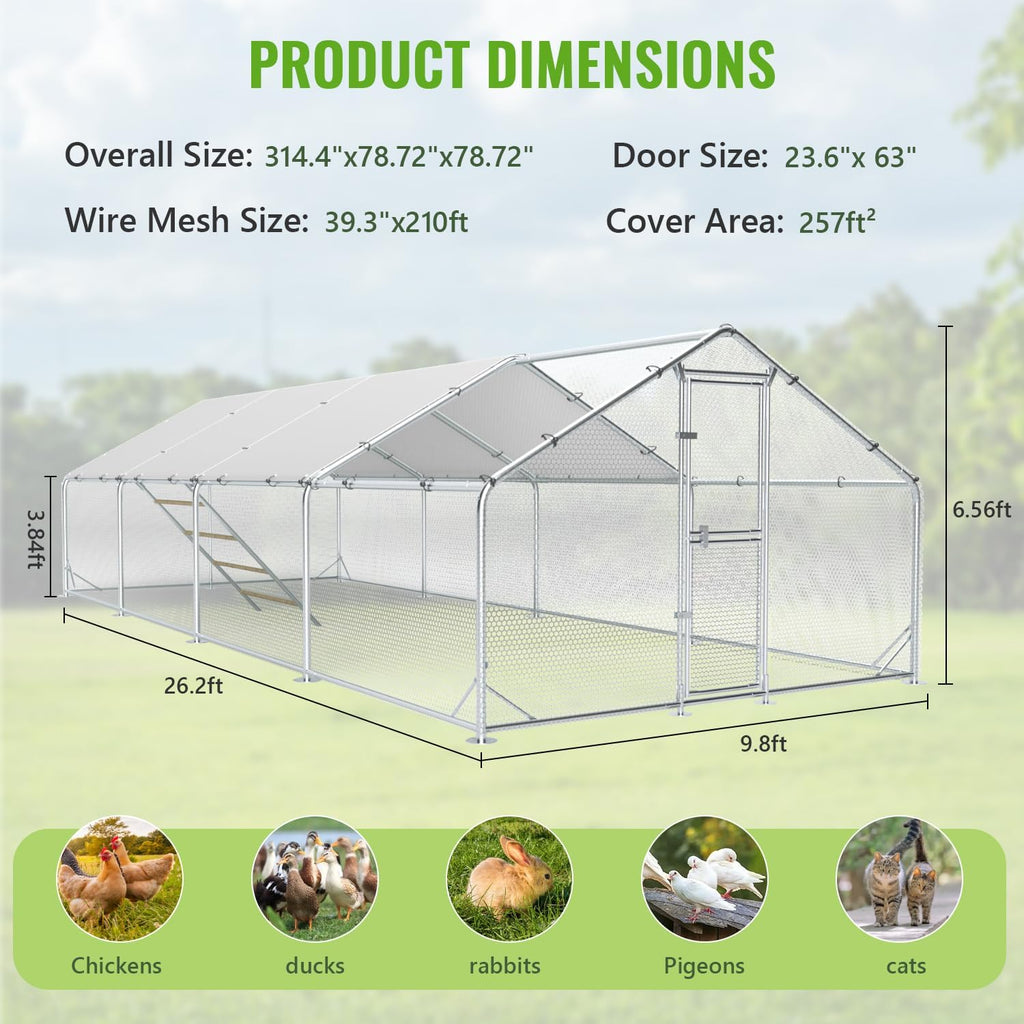 Anti- Rust and Durable Steel Structure:The chicken coop uses a high-quality steel pipe frame, coupled with galvanizing technology, don't worry about rusting in outdoor. The steel pipe is strong and stable enough in windy and heavy rain